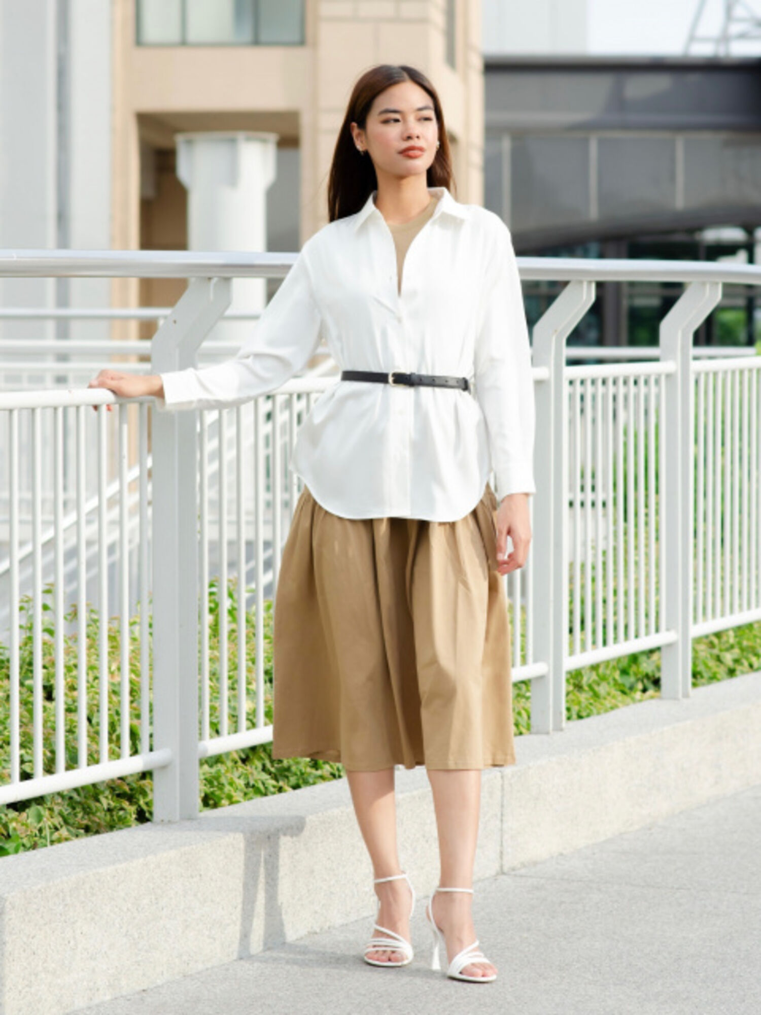 With a shirt, you can mix and match various skirt styles like A-line skirts, pleated skirts, midi skirts, and more to create outfits with diverse and impressive fashion flair. Don’t forget to add accessories like shoes, hats, or handbags to elevate your outfit further.