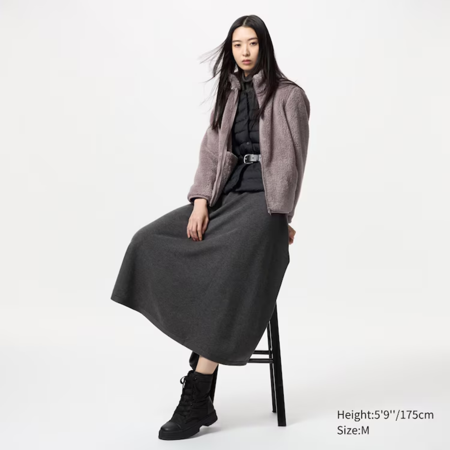 Pairing a knee-length skirt with a shearling jacket creates a warm and trendy style for cold winter days. Choose short or long shearling jackets based on your preference and body shape. For colors, neutral tones like white, black, cream, blue, or gray can add a striking touch to your outfit.