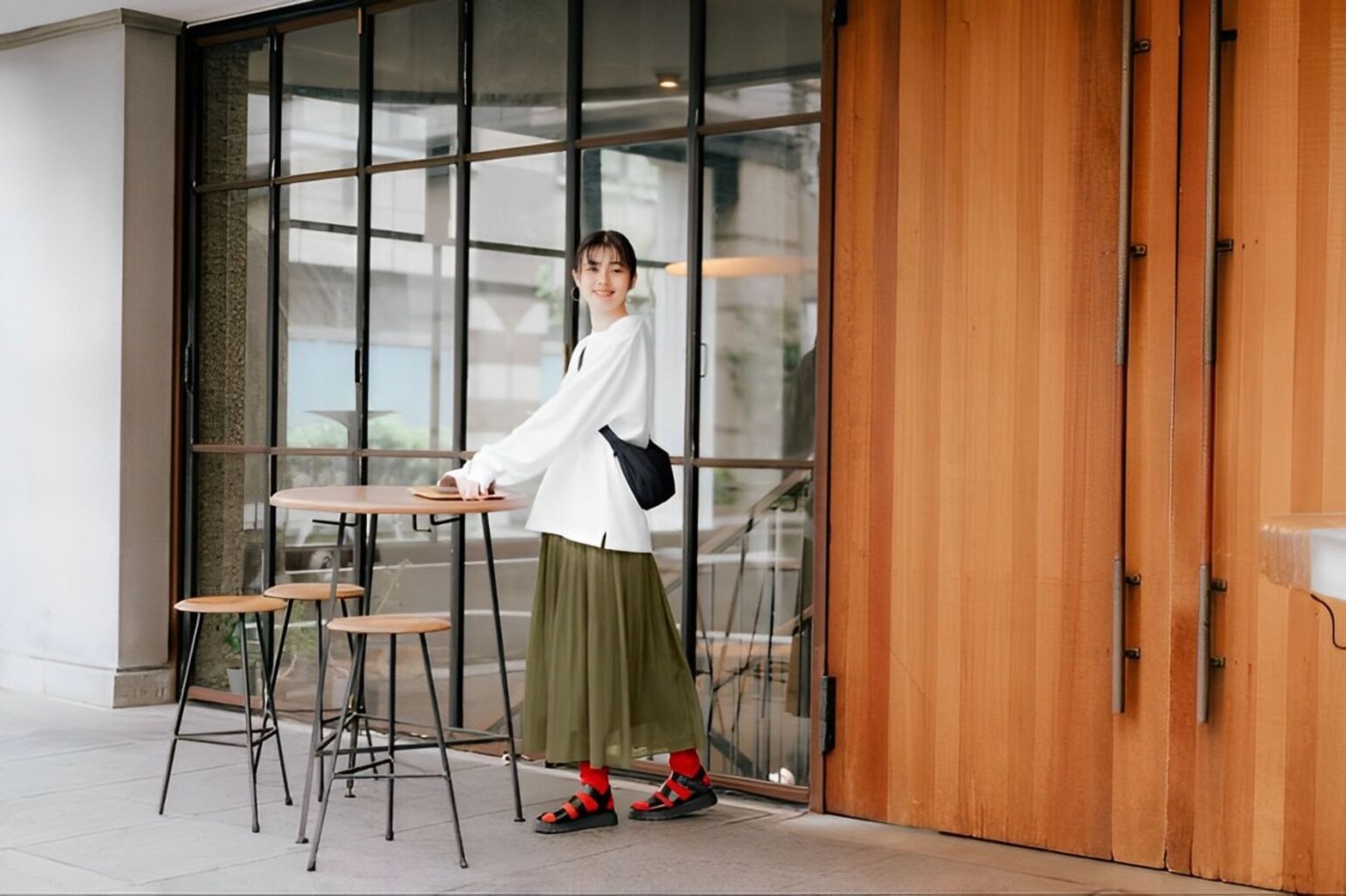In chilly weather, pairing a knee-length skirt with a cardigan creates a light and feminine fashion look. Don’t forget to add sneakers or sandals to complete the outfit.
