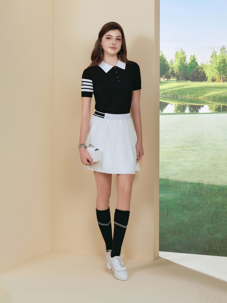 - Simple but still luxurious and modern design with pleated flared skirt and stylized logo accent on the back of the skirt