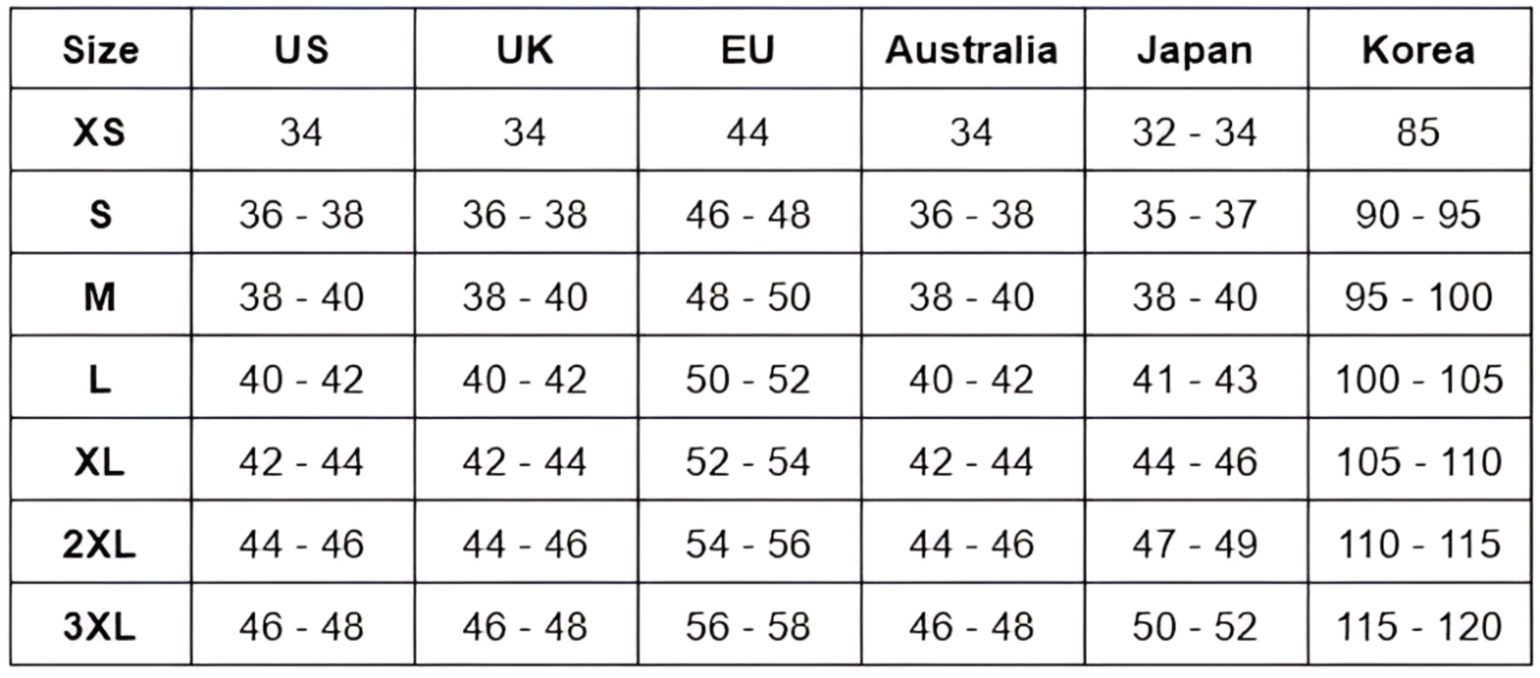 Note: The men’s t-shirt size chart above is for reference only and does not apply to Mipa Golf products.