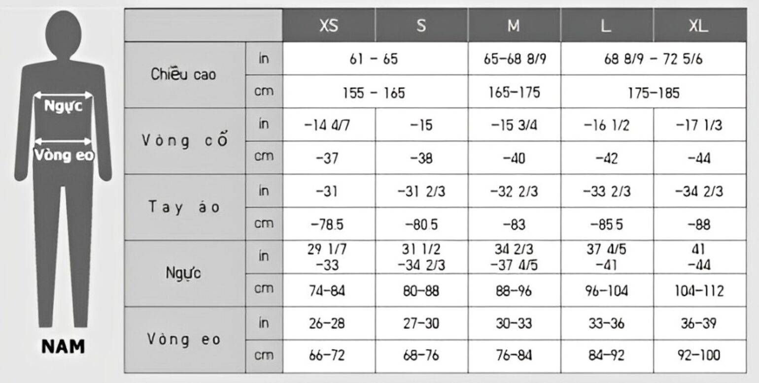 - Size XS - S (Small): Suitable for men with a petite frame, with a height of approximately 155 - 165 cm and a weight of 55 - 60 kg.