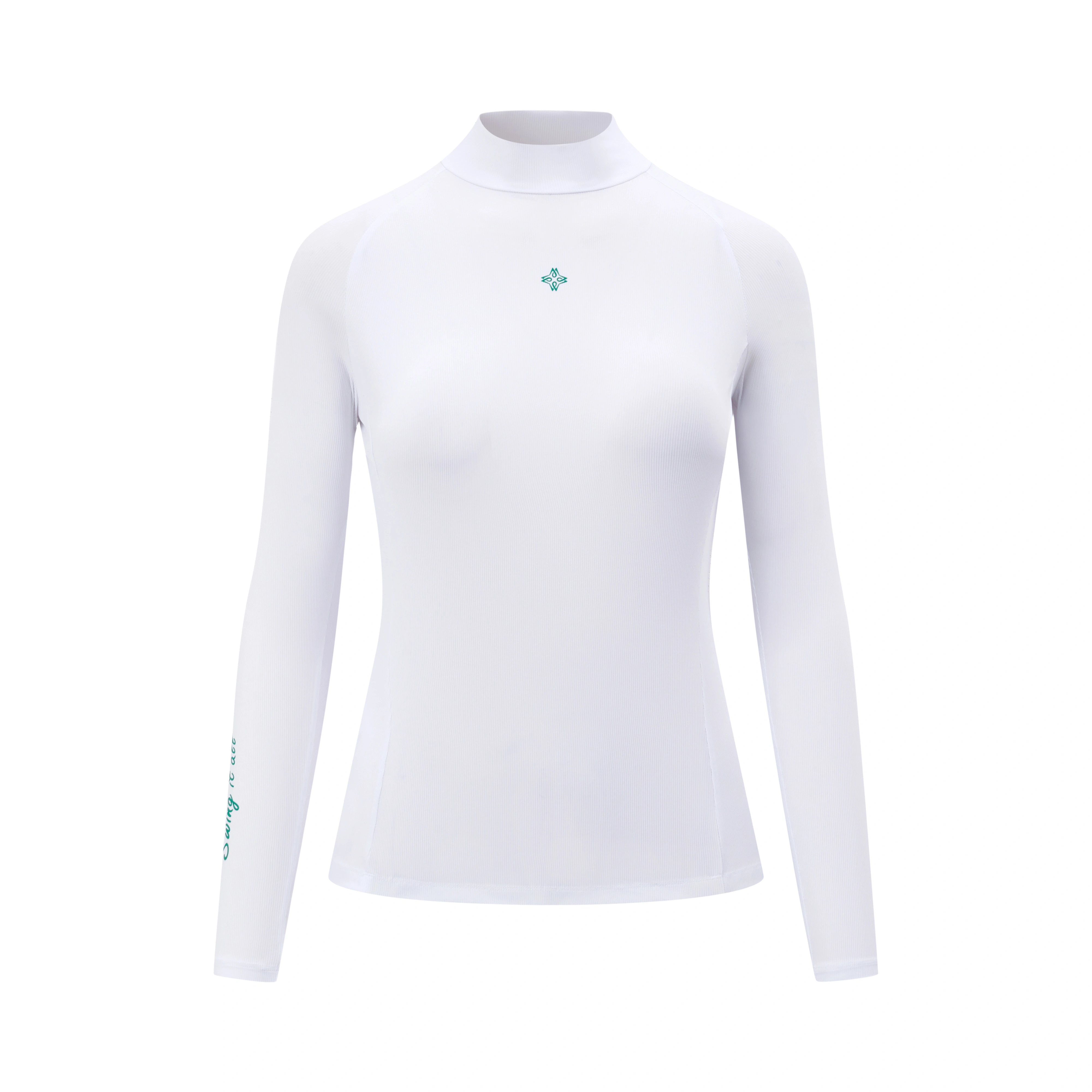 The women's long-sleeve UV Shield Baselayer golf shirt features a diagonal neckline and is made with European-sourced fabric. This high-performance fabric offers exceptional moisture-wicking and quick-drying properties, along with UPF protection. The 4-way stretch ensures unrestricted movement for a comfortable swing. Its fitted design accentuates the waistline.