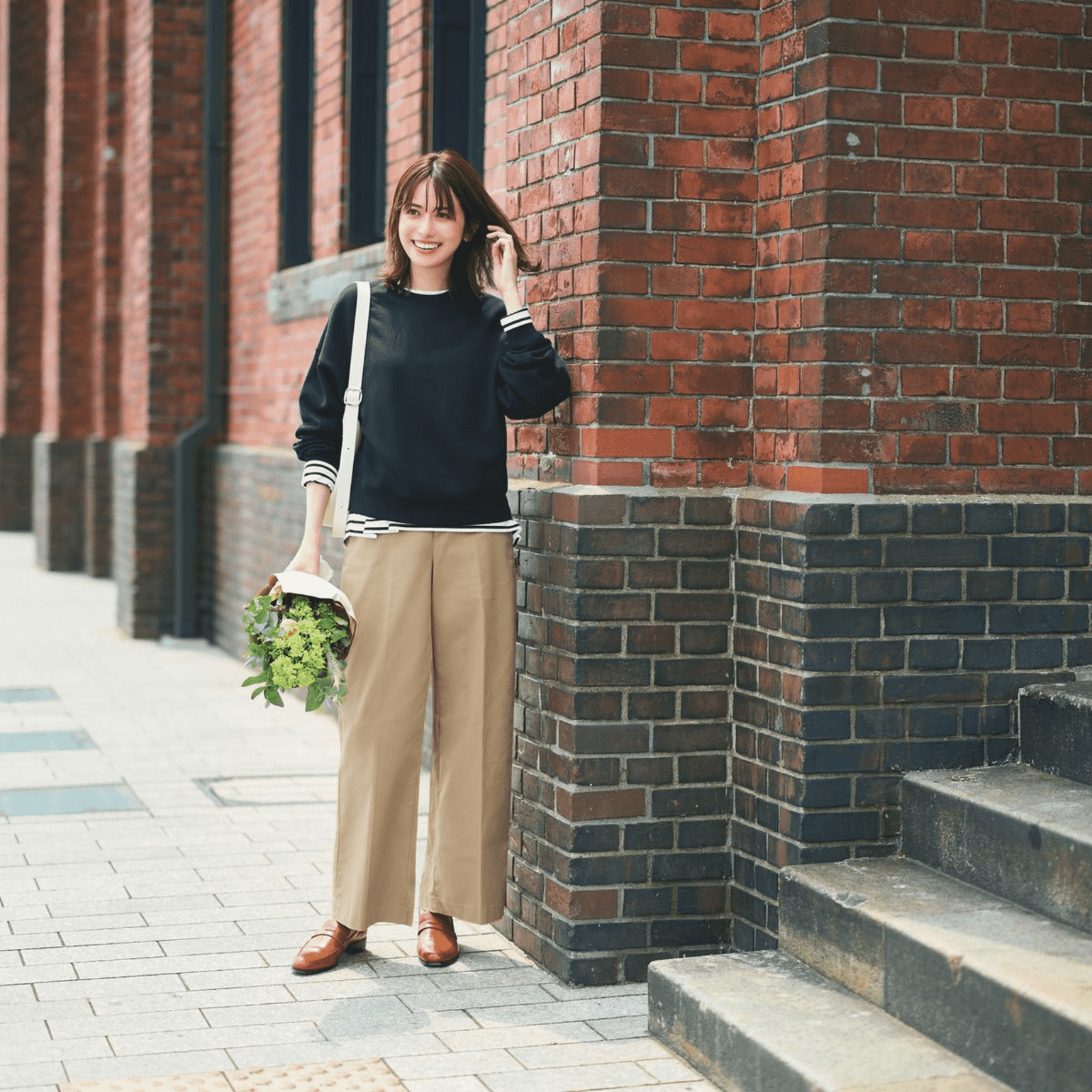 Navy blue and brown together offer a sophisticated, classic, yet captivating aesthetic. A navy blue bratop or brown jacket paired with earthy brown trousers creates a mature look suitable for various occasions. Especially in autumn, this combo keeps you warm while showcasing refined style. Complete it with brown leather shoes, a matching belt, or a handbag for a cohesive and impressive finish.