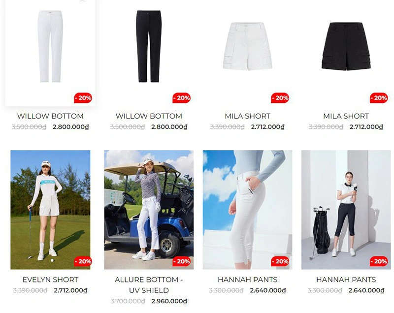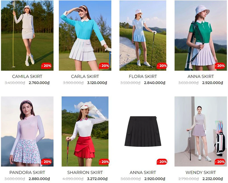 Depending on the season and course requirements, women golfers can choose between skirts or long pants. For spring or autumn, either option is suitable. In winter, long pants are the most practical choice. When it comes to skirts, opt for styles that are not too tight, flatter your figure, and reflect a sporty yet sophisticated style. For the current weather, the Camila Skirt, Carla Skirt, Flora Skirt, Anna Skirt, and Sharron Skirt are excellent choices, ranging from 150$ to VND 250$.